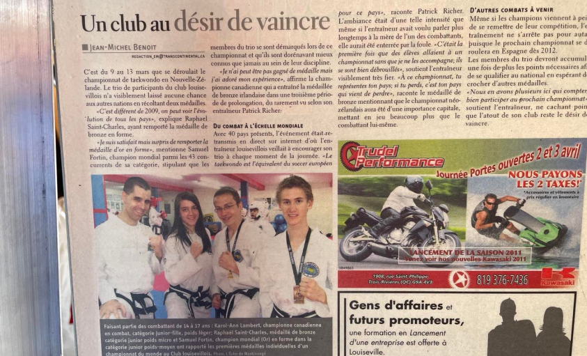 Il s’agit d’une date historique dans l’histoire du club, car le club avait ses 2 premiers représentants lors des championnats mondiaux juniors de Taekwon-do; Simon et Nicolas Bergeron. En plus d’avoir M. Patrick Richer comme membre de l’équipe de coach sur l’équipe canadienne.